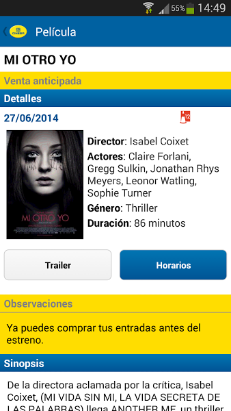 Independientemente del tipo de films que suelas ver tus gustos se ven reflejados en esta aplicación, ya que la cartelera que te muestra abarca multitud de géneros cinematográficos. Los horarios pueden hacer referencia tanto a los cines del grupo que están cerca de tu ubicación como a aquellos que pertenecen a otras provincias distintas, siendo posible ordenarlos ascendentemente. Dependiendo del cine elegido podrás aprovecharte de unas u otras promociones, además de disfrutar de las ventajas proporcionadas por la tarjeta cliente conocida como Cinesacard.